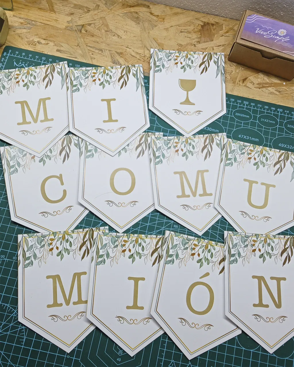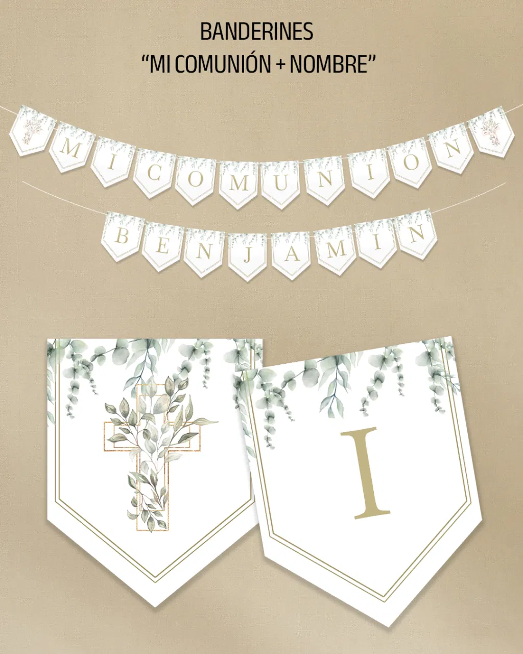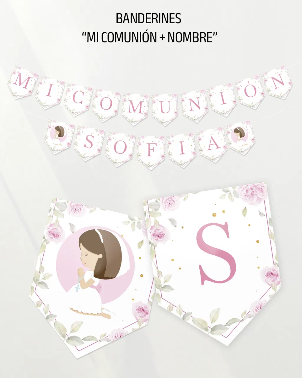 Incluye 2 banderines de cierre con diseño especial acorde al evento + la frase “Mi Comunión” + el nombre.