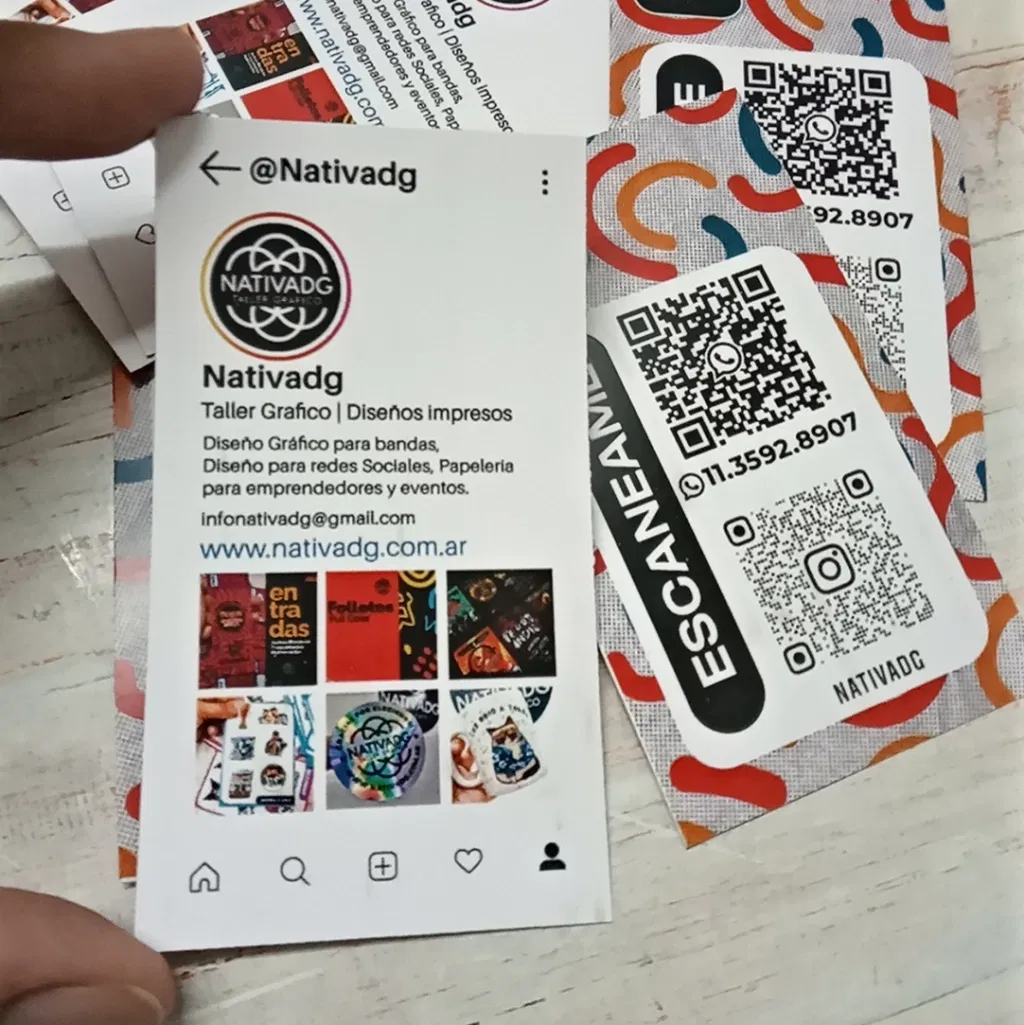 Estas tarjetas simulan tu perfil de Instagram: en el frente incluyen tu foto de perfil, la descripción y 4 o 6 fotos de tu feed; en el dorso, tu QR directo a Instagram y el logo de tu emprendimiento en grande.